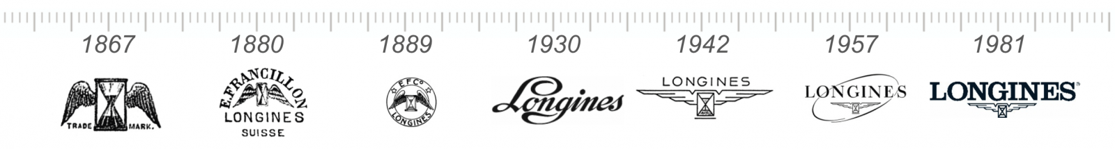 Năm 1867, Francillon quyết định lấy tên cho những chiếc đồng hồ của mình không phải bằng tên riêng của mình mà bằng tên thương mại Longines và thêm một nhãn hiệu: Ernest Francillon quyết định khắc một chiếc đồng hồ cát có cánh trên thanh cân bằng của tất cả các chuyển động được sử dụng trong đồng hồ Longines.